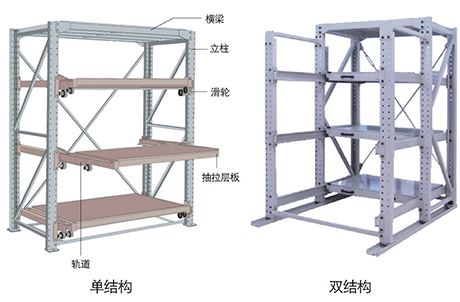 4、輕型模具貨架層載在200~800kg/層。重型抽屜式貨架層載在:800~1500kg/層。